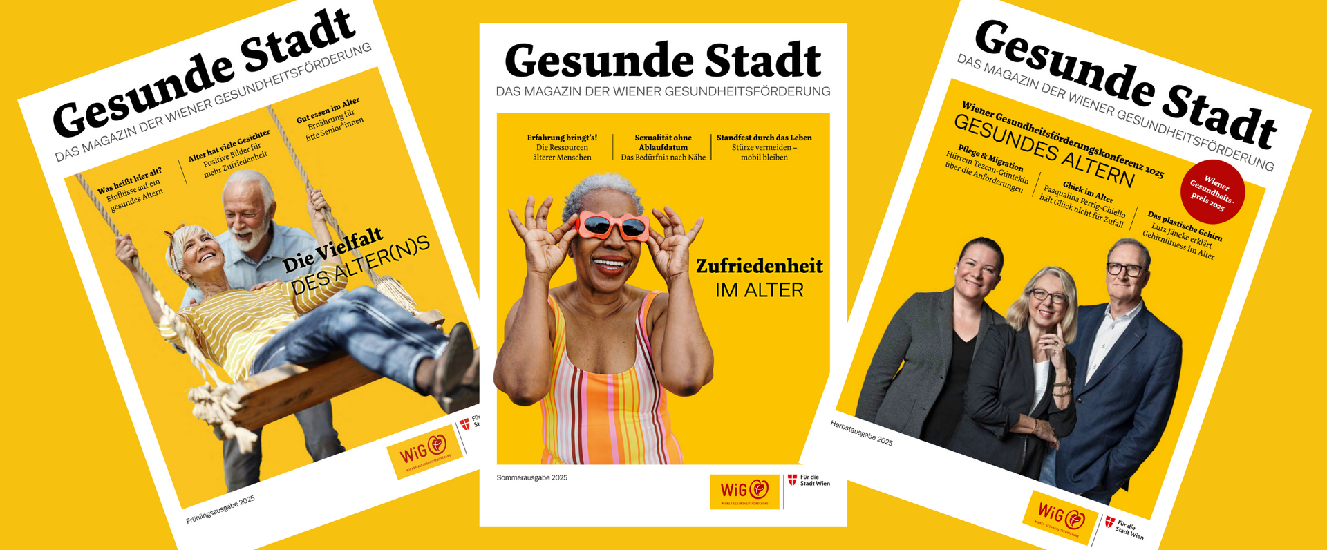 Das Magazin „Gesunde Stadt“ erscheint viermal jährlich. Die Sonderausgabe zu Beginn des Jahres beschäftigt sich mit aktuellen Entwicklungen und Trends der Themenschwerpunkte Bewegung, Ernährung und Seelische Gesundheit. Der Fokus der Frühlings- und der Sommerausgabe liegt auf dem jeweiligen Jahresschwerpunkt der Wiener Gesundheitsförderung – WiG. Eine Nachlese über die Wiener Gesundheitsförderungskonferenz und die Verleihung des Wiener Gesundheitspreises findet sich in der Herbstausgabe.