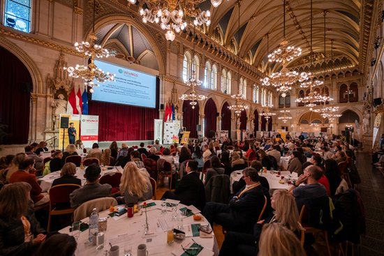 v.l.n.r.: Dennis Beck (Geschäftsführer, Wiener Gesundheitsförderung – WiG), Dr.in Sabine Maria Kiesel (Mitglied des Landesstellenausschusses, Österreichische Gesundheitskasse Wien), HRin Mag.a Ulrike Mangl (Leiterin des Bereichs Pädagogischer Dienst, Bildungsdirektion Wien) und HS-Prof. Mag. Dr. Norbert Kraker (Vizerektor der Pädagogischen Hochschule Wien) waren bei der Eröffnung der 28. WieNGS Jahrestagung im Wiener Rathaus. © Klaus Ranger