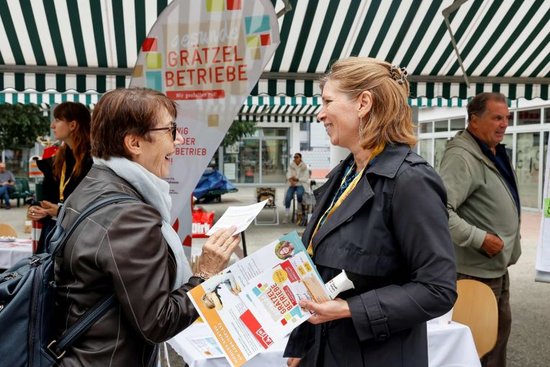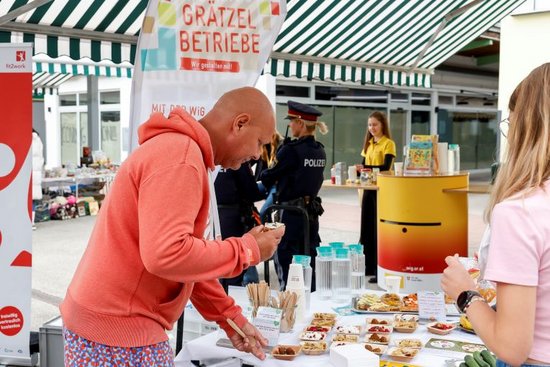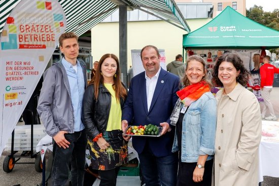 v.l.n.r.: Matthias Hümmelink, BA MPH (Mitglied der Geschäftsführung WiG), Silvia Lang (WK Bezirksobfrau Leopoldstadt), Alexander Nikolai (Bezirksvorsteher Leopoldstadt), Mag.a (FH) Heidrun Rader (WiG – Gesundheitsreferentin und Projektleiterin „Gesunde Grätzel-Betriebe“) und Mira Liepold, MA MA (WiG-Gesundheitsreferentin und Programmleiterin Gesunde Leopoldstadt) waren beim Marktplatz Gesunde Grätzel Betriebe vor Ort. © Mirjam Reither