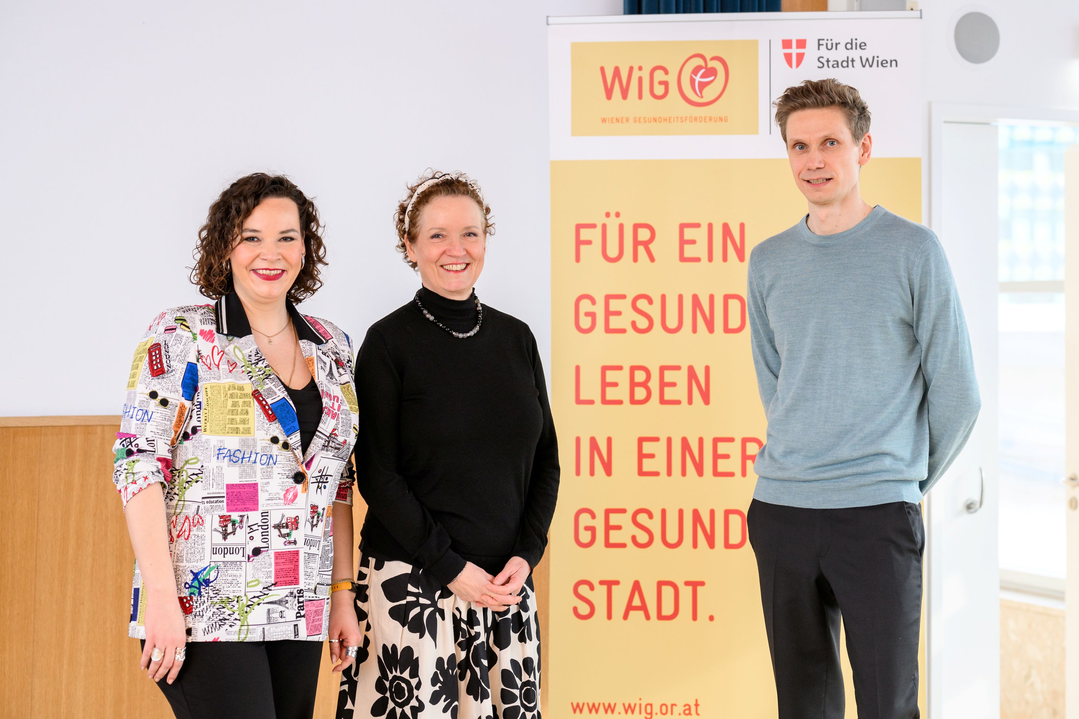 v.l.n.r.: Dr.in Yvonne Prinzellner (Public-Health-Forscherin, Gender, Medien und Frauengesundheit), Mag.a Kristina Hametner (Leiterin des Büros für Frauengesundheit) und Matthias Hümmelink, BA MPH, (Mitglied der Geschäftsleitung - WiG) eröffneten die Veranstaltung „Gesundheitsförderung im Gespräch“ im Dachsaal der Urania. © WiG / Klaus Ranger