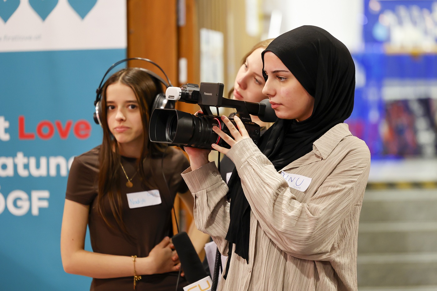 Ein kleines Team aus Jugendlichen war bei der Jugendgesundheitskonferenz mit Kamera und Mikrofon unterwegs, um die Highlights des Tages aufzunehmen. © WiG/Mirjam Reither